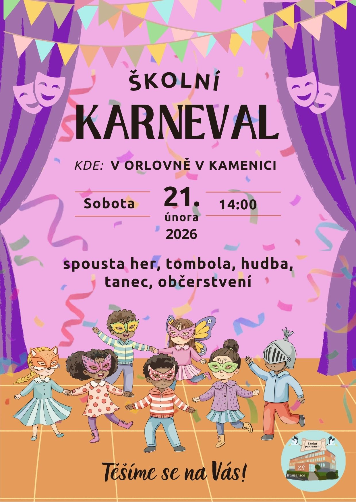 V sobotu 21. února 2026 od 14:00 h se uskuteční tradiční školní karneval v Orlovně v Kamenici.