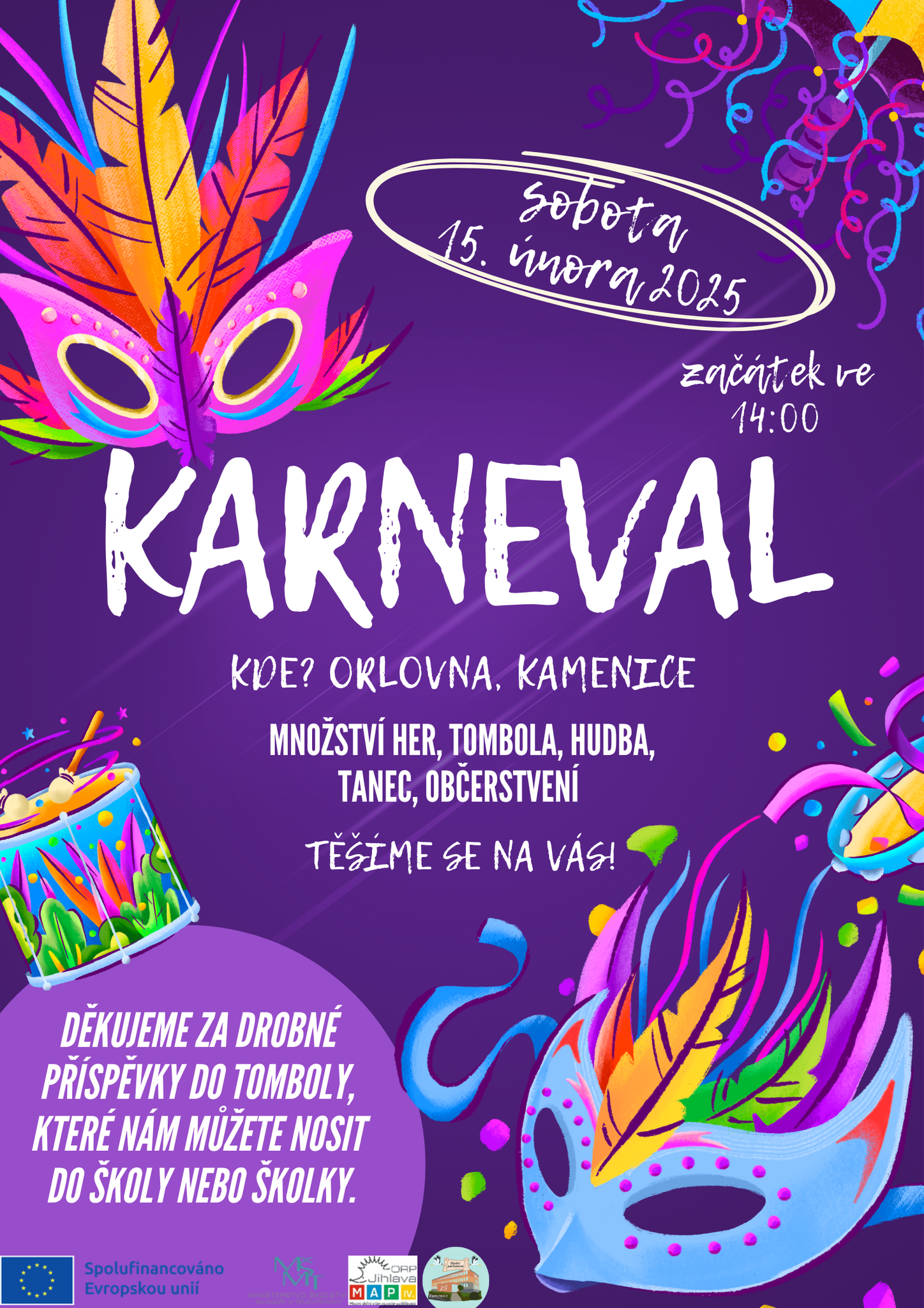 v sobotu 15. února se uskuteční tradiční školní karneval. Případné příspěvky do tomboly prosím přinášejte nejpozději do středy 12. února. Předem děkujeme. Více viz přiložený plakát.